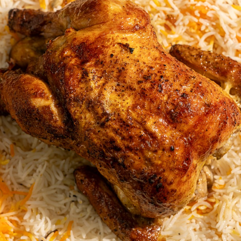 (3264 سعرة حرارية)دجاج مظبي على الحجر مع تتبيله التندوري المميزه تقدم مع الارز المندي ( الابيض مع الزعفران )يقدم مع 3 انواع صوصات ( دقوس + خيار لبن + صوص اسبيشال)
