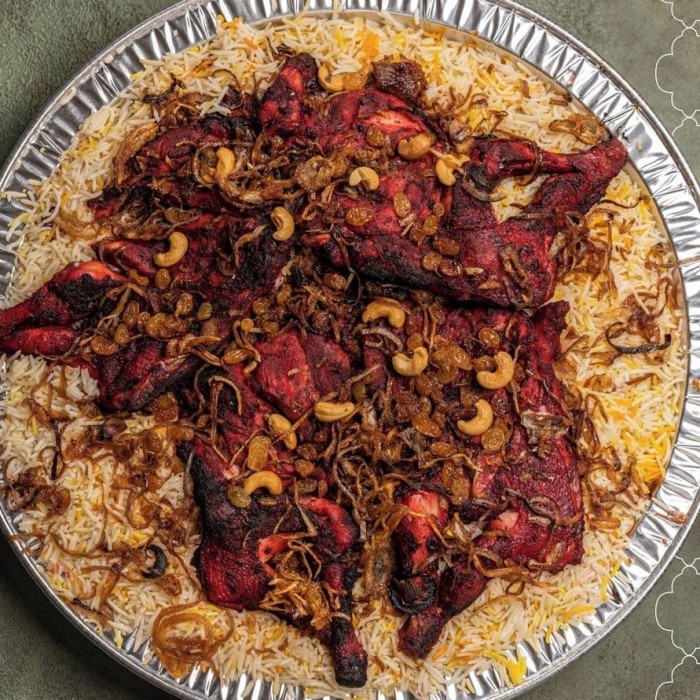 (4896 سعرة حرارية)دجاج مظبي على الحجر مع تتبيله التندوري المميزه تقدم مع الارز المندي ( الابيض مع الزعفران )يقدم مع 3 انواع صوصات ( دقوس + خيار لبن + صوص اسبيشال)