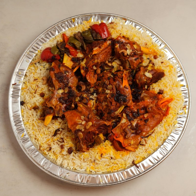 (3903 سعرة حرارية)لحم نعيمي بلدي مطبوخ مع صوص البرياني المميز مع الارز الملون ابيض واصفر واحمر مع الكشنه ( البصل والزبيب المكرمل والكاجو ) يقدم مع 3 انواع صوصات ( دقوس + خيار لبن + صوص اسبيشال )